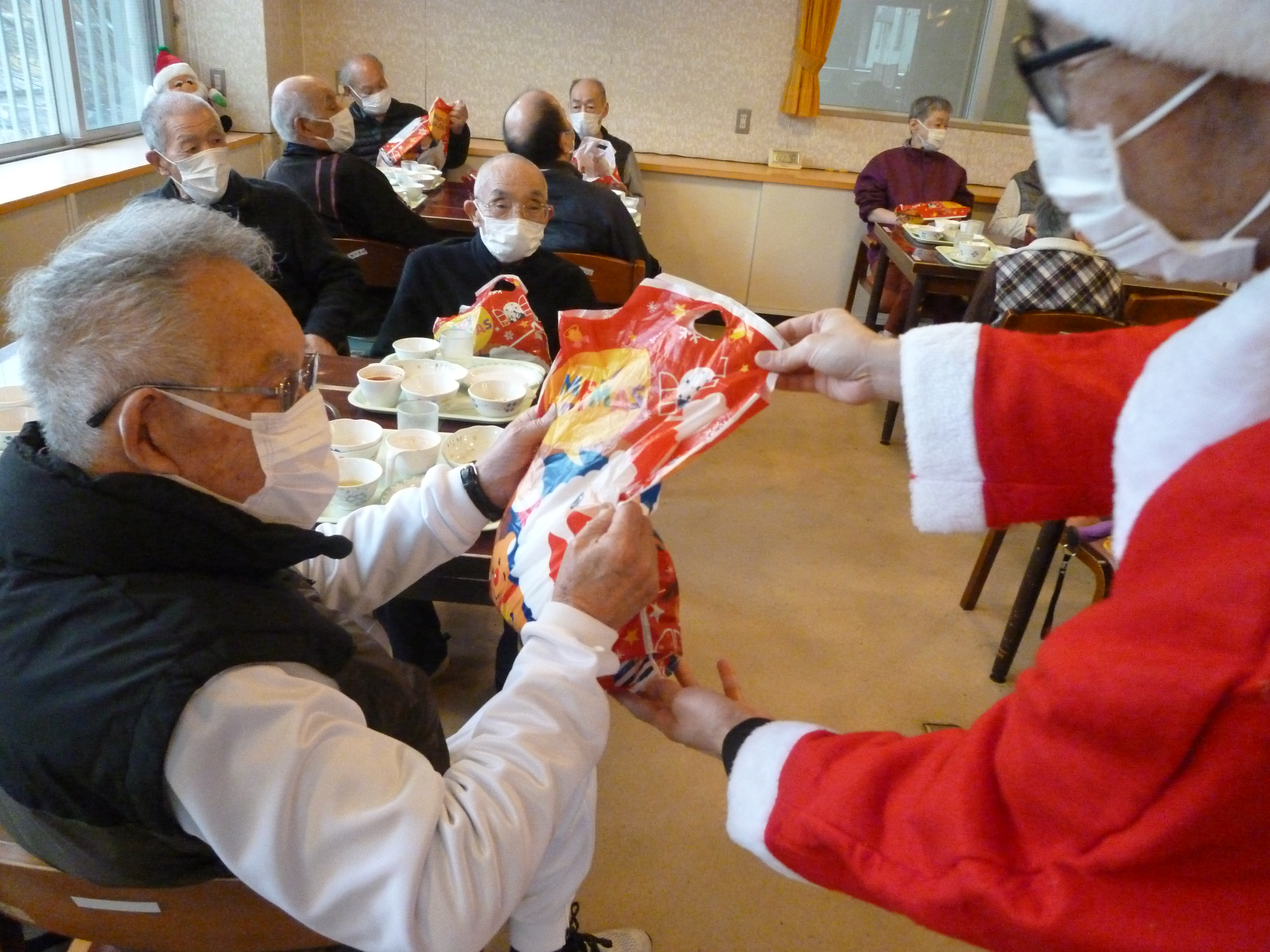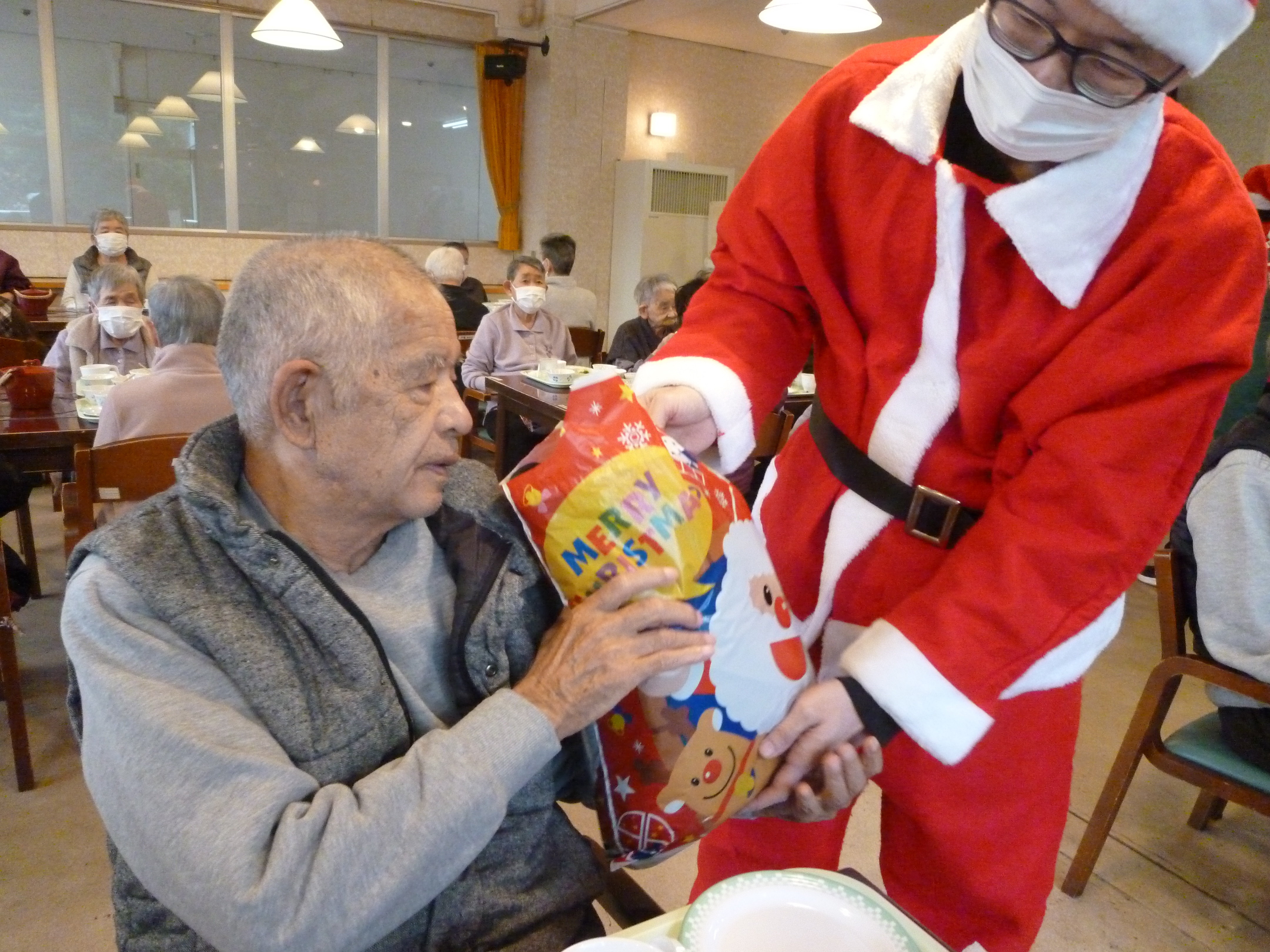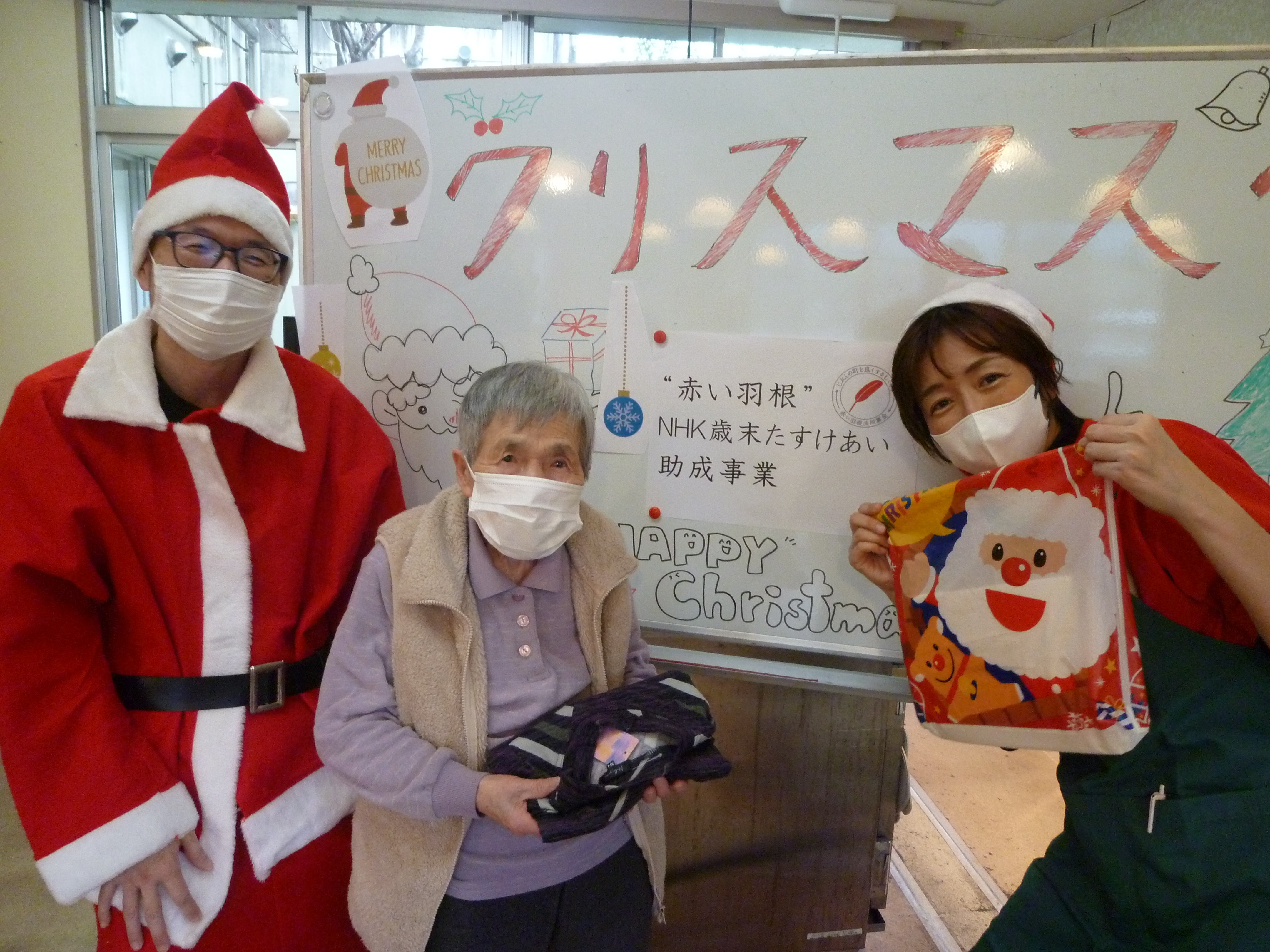 クリスマス会 12/25 奥山老人ホームではクリスマス会を行いました!🎄🔔 今年も施設長がサンタとなり、入所者様へ笑顔とプレゼントを配りました!🎅 プレゼントには静岡県共同募金会 NHK歳末たすけあい助成を利用させていただきました! ありがとうございました!
